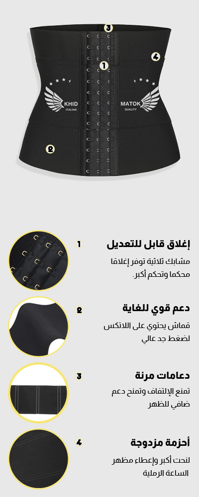 • مزود بـ 3 دعامات مرنة: لدعم الظهر ومنع أي التواء أو تحرك خلال اليوم.