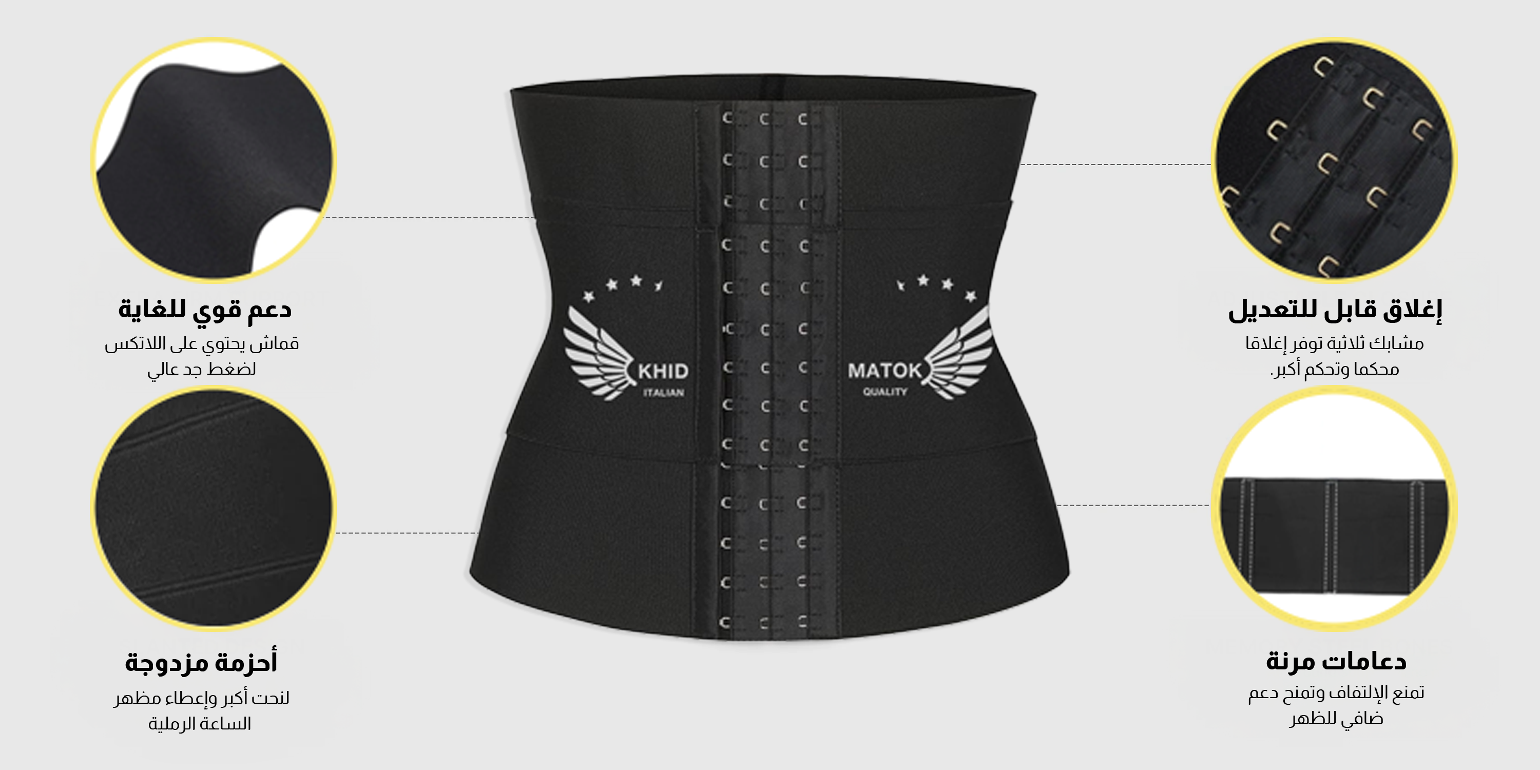 • مصنوع من لاتكس إيطالي عالي الجودة: متين، مرن، ويمنحك ضغطا مثاليا لنحت الخصر وإخفاء الترهلات.